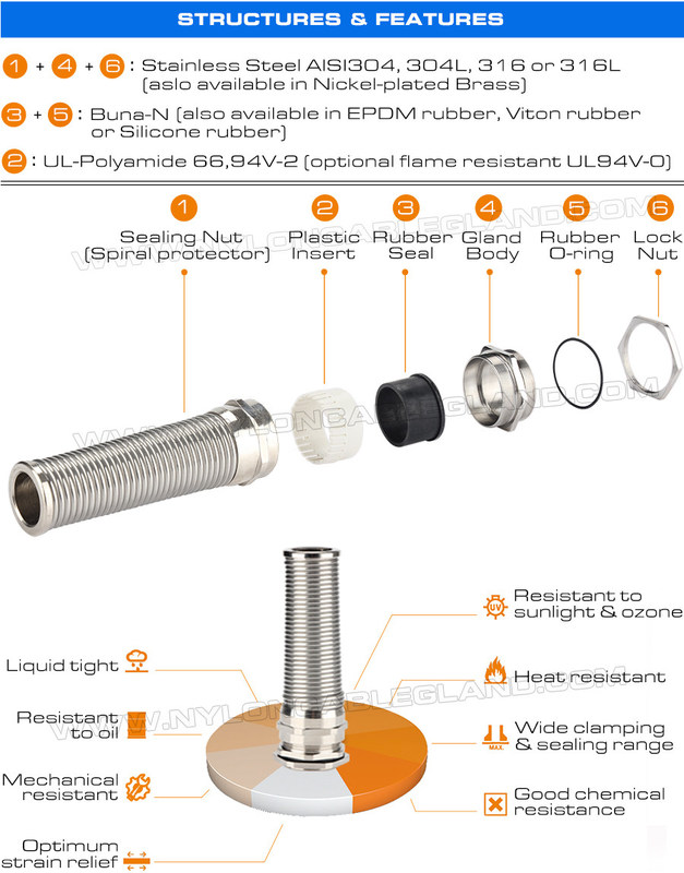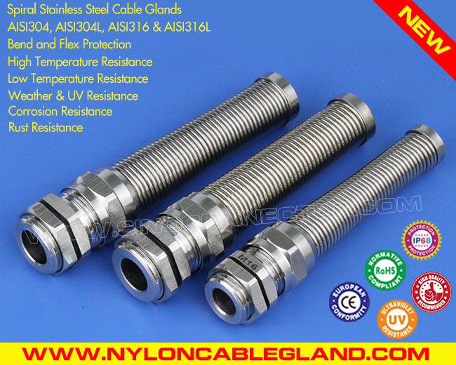 Avec les avantages d'une résistance élevée aux chocs, d'une large plage de serrage, d'une résistance aux hautes et basses températures et aux intempéries, presse-étoupes métriques hermétiques IP68 M12~M50 en acier inoxydable type 304/316/316L avec protection anti-torsion et courbure sont livrés avec un ressort de protection en spirale supplémentaire. et ont la capacité de résistance chimique, de résistance à la corrosion et de résistance à la chaleur, et il a également la capacité de haute résistance à la traction, de haute ténacité, de bonne résistance à l'eau, d'excellente protection contre la flexion et de longue durée de service.