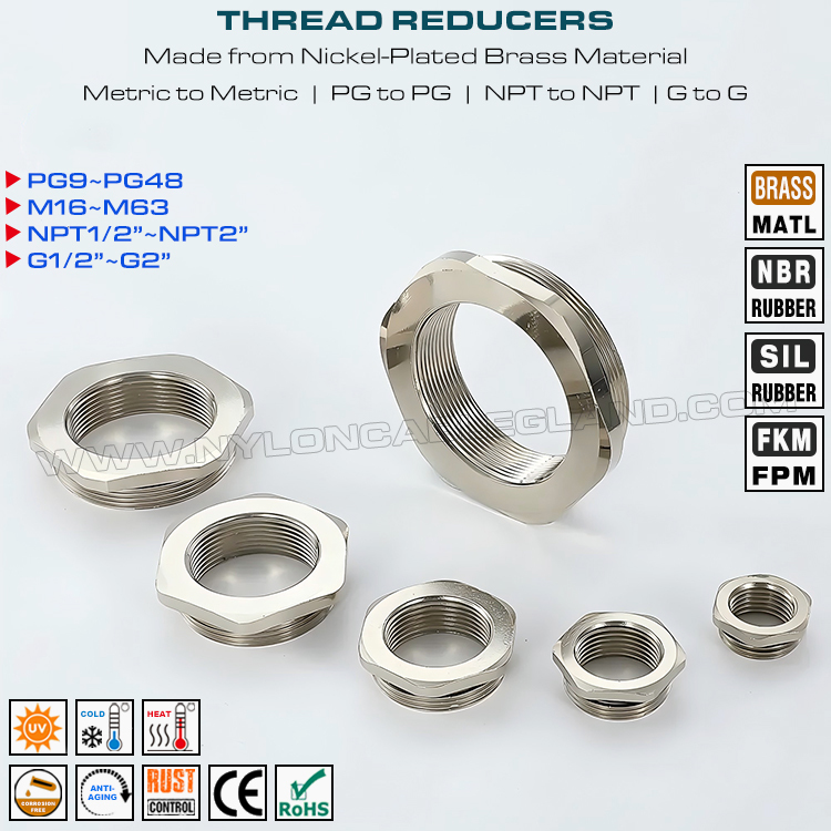 Fabriqués en laiton ou en acier inoxydable 304, 316 ou 316L, ce sont de nouveaux raccords standard qui sont utilisés pour réduire, agrandir ou adapter les tailles de filetage, ils sont conçus avec un type rond ou hexagonal et disponibles dans une sélection de tailles standard. Ajoutez des filetages de taille identique ou inférieure aux trous de dégagement, adaptez les trous filetés à différentes tailles ou systèmes d'unités, ils fournissent une méthode de connexion simple et fiable entre les presse-étoupes et les filetages plus petits.
