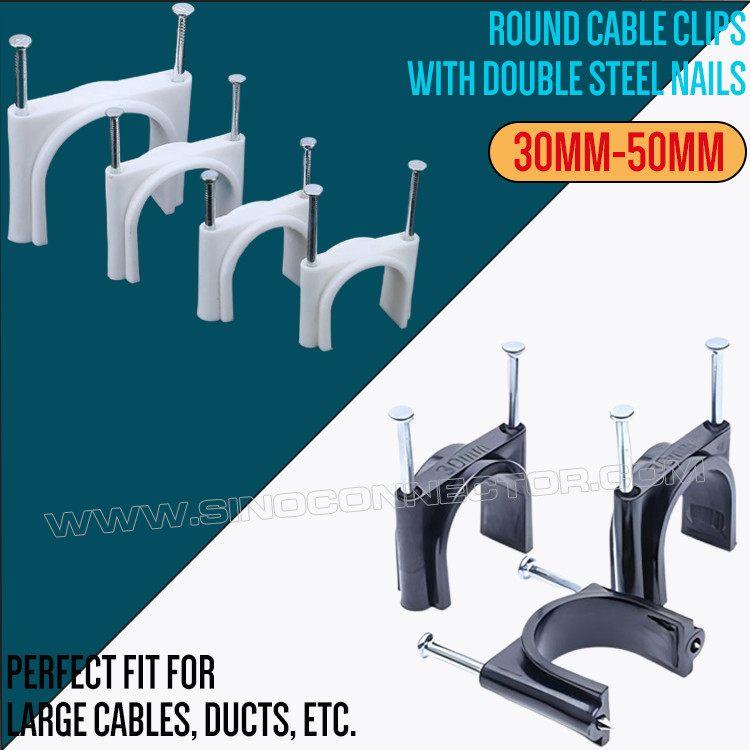 Les attaches câbles pontet circulaires comprennent des clous en acier à teneur moyenne en carbone (ou à haute teneur en carbone) dans le boîtier extérieur. Les serre-câbles à clous sont très couramment utilisés dans les travaux professionnels et de bricolage, du rangement d'Ethernet et de tubes au passage de fils pour l'éclairage ou l'alimentation externe. Ils sont disponibles en modèles ronds ou plats avec de nombreuses tailles, formes et matériaux, ce qui ajoute à leur popularité.